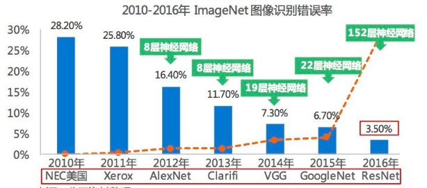 技術(shù)驅(qū)動(dòng)階段集中誕生了基礎(chǔ)理論、基本規(guī)則和基本開(kāi)發(fā)工具。在此階段,算法和計(jì)算力對(duì)AI的發(fā)展起到主要推動(dòng)作用。現(xiàn)在主流應(yīng)用的基于多層網(wǎng)絡(luò)神經(jīng)的深度算法,一方面不斷加強(qiáng)從海據(jù)庫(kù)中自行歸納物體特征的能力,一方面不斷加強(qiáng)對(duì)新事物多層特征提取、描述和還原的能力。對(duì)算法來(lái)說(shuō),歸納和演繹同樣重要,最終目的是提高識(shí)別效率。最新ImageNet測(cè)試結(jié)果顯示,AI錯(cuò)誤率低達(dá)3.5% ,而人類(lèi)對(duì)同一數(shù)據(jù)庫(kù)識(shí)別錯(cuò)誤率在5.1%,理想情況下,計(jì)算機(jī)圖像識(shí)別能力已超越人類(lèi)。